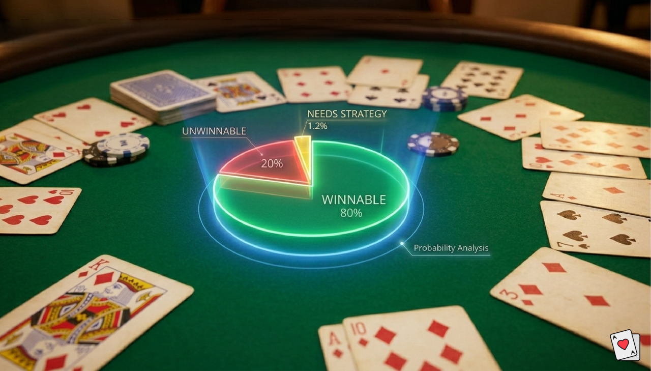 Roughly 79% of Klondike Draw 1 deals are theoretically winnable — meaning a perfect player with perfect information could solve them. In practice, experienced players win about 55–65% of games. The gap between those two numbers is where all the strategy actually matters.